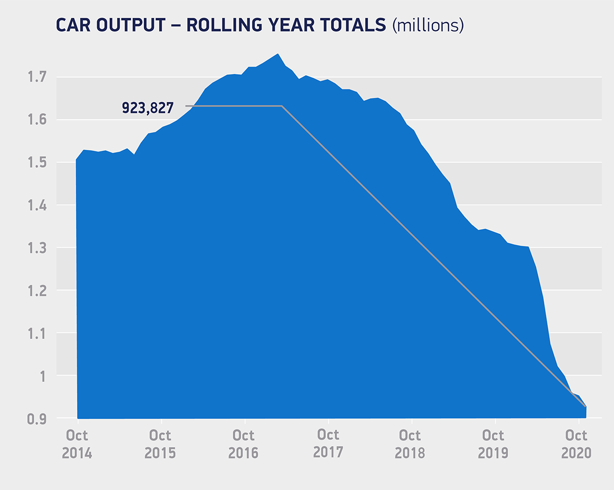 October’s performance rounds off an extremely tough 10 months for UK car makers and suppliers, and production is now down -33.8% since January to 743,003 units – a year on year shortfall of 379,308 units worth some £10.4 billion.1