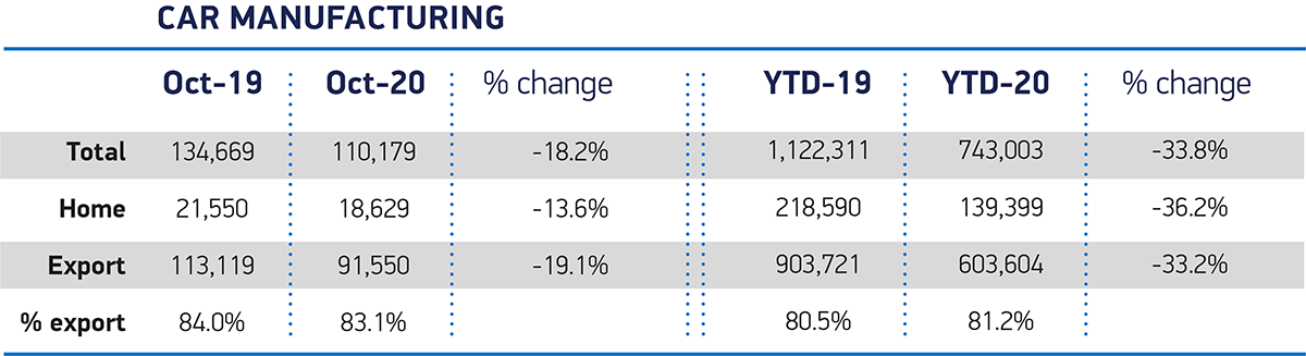 - UK car production falls -18.2% in October with 110,179 units leaving factory gates.