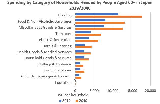 2040年、日本国内の家長の年齢が60歳以上の世帯の支出額が合計で2.2兆米ドルに達するなど、同国の高齢者層は大きな潜在市場としてビジネスチャンスを意味します。