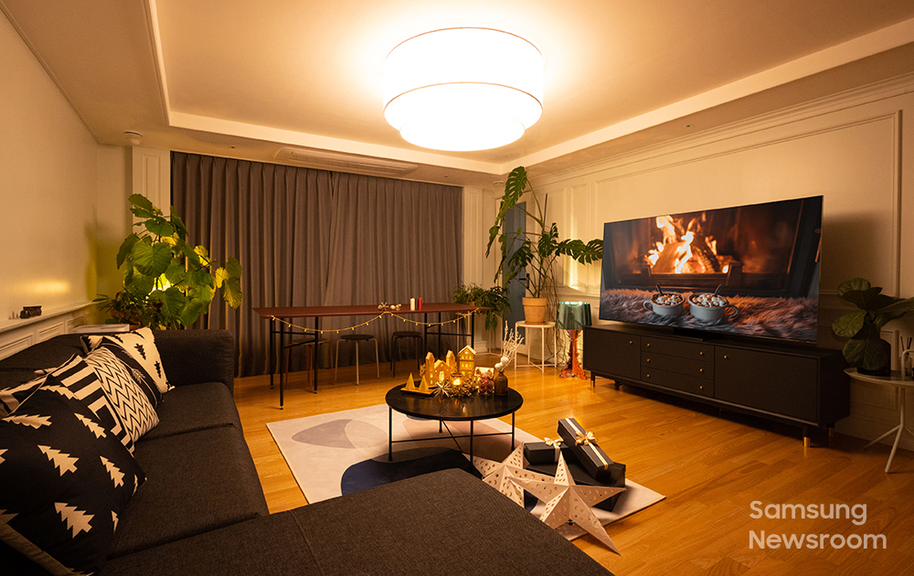 Samsung QLED 8K’s Ambient Mode allows you to do just that. The feature adds a fun new dimension to decorating your living space by transforming your TV’s off screen into an immersive canvas. It’s perfect for those of us who love watching cozy content around the holidays, because it offers us more opportunities to enjoy festive imagery.